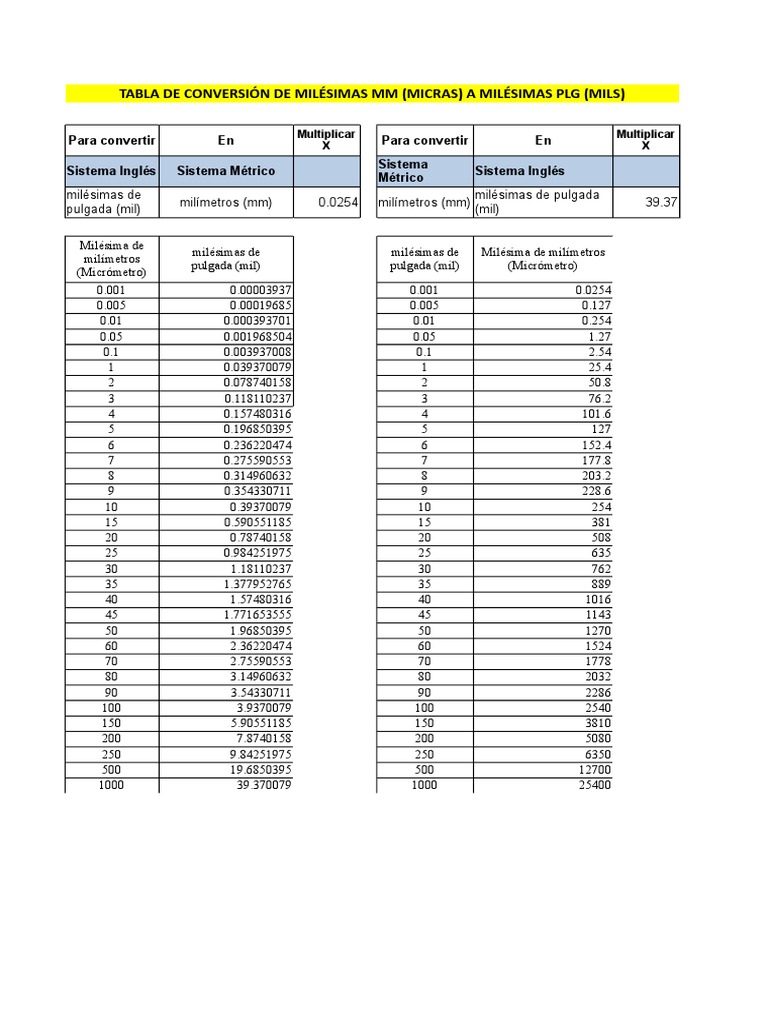 Estádios em Micrómetros μm. One mil is equal to 254 µm. La micra es extremadamente pequeña tan pequeña para ser vista a simple vista. TABLA DE CONVERSIÓN DE MILÉSIMAS MM MICRAS A MILÉSIMAS PLG MILS Multiplicar Multiplicar Para convertir En X Para convertir En X Sistema Sistema Inglés Sistema Métrico Sistema Inglés Métrico milésimas de milésimas de pulgada milímetros mm 00254 milímetros mm 3937 pulgada mil mil. Why Packaging Thickness is Important. 20 Micrómetros 002 Milímetros.